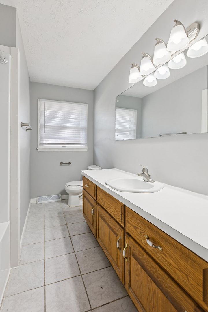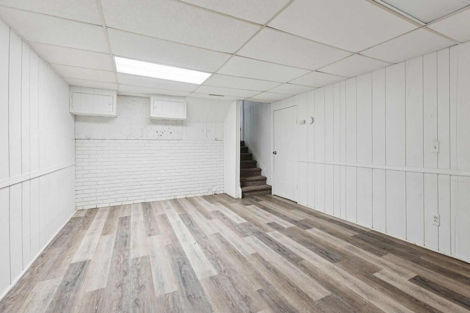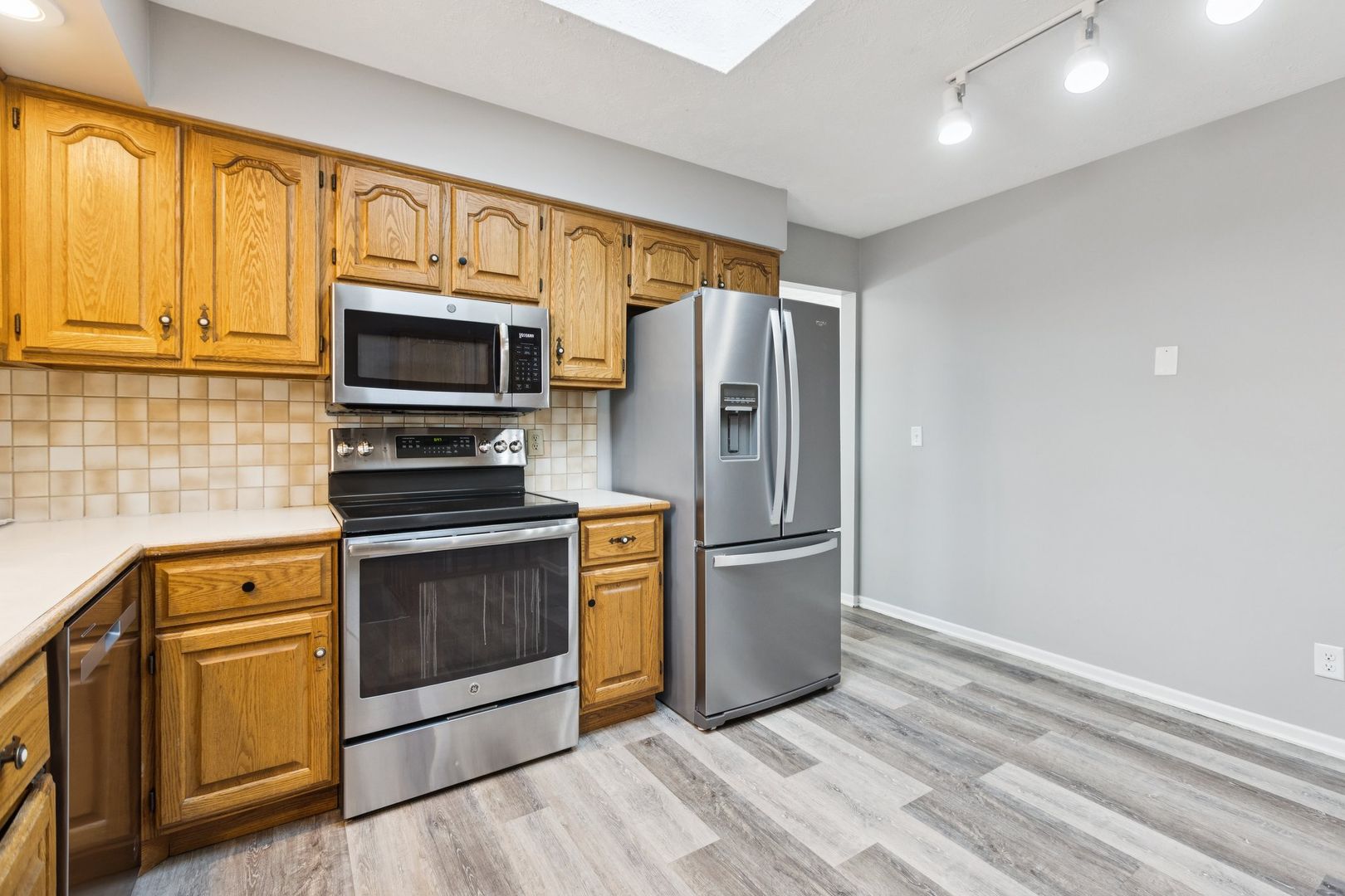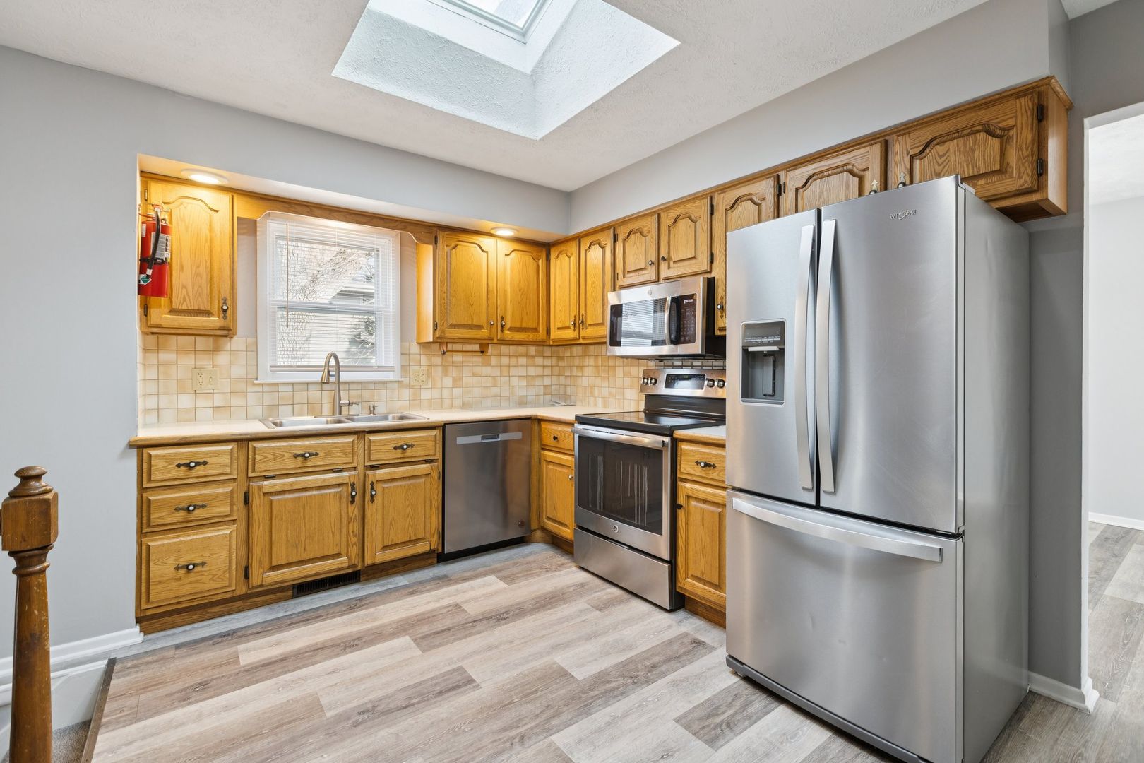 The kitchen includes a skylight that fills the space with natural light, and the finished lower level adds even more flexibility for work, play, or storage.