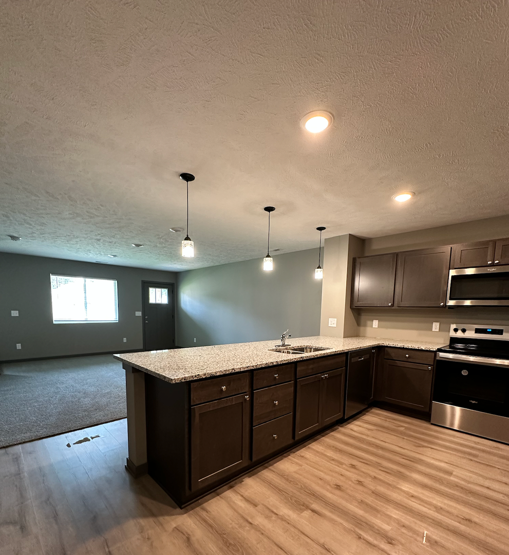 The kitchen features modern appliances, generous counter space, and abundant storage, flowing seamlessly into the spacious living room, an ideal setup for everyday living.