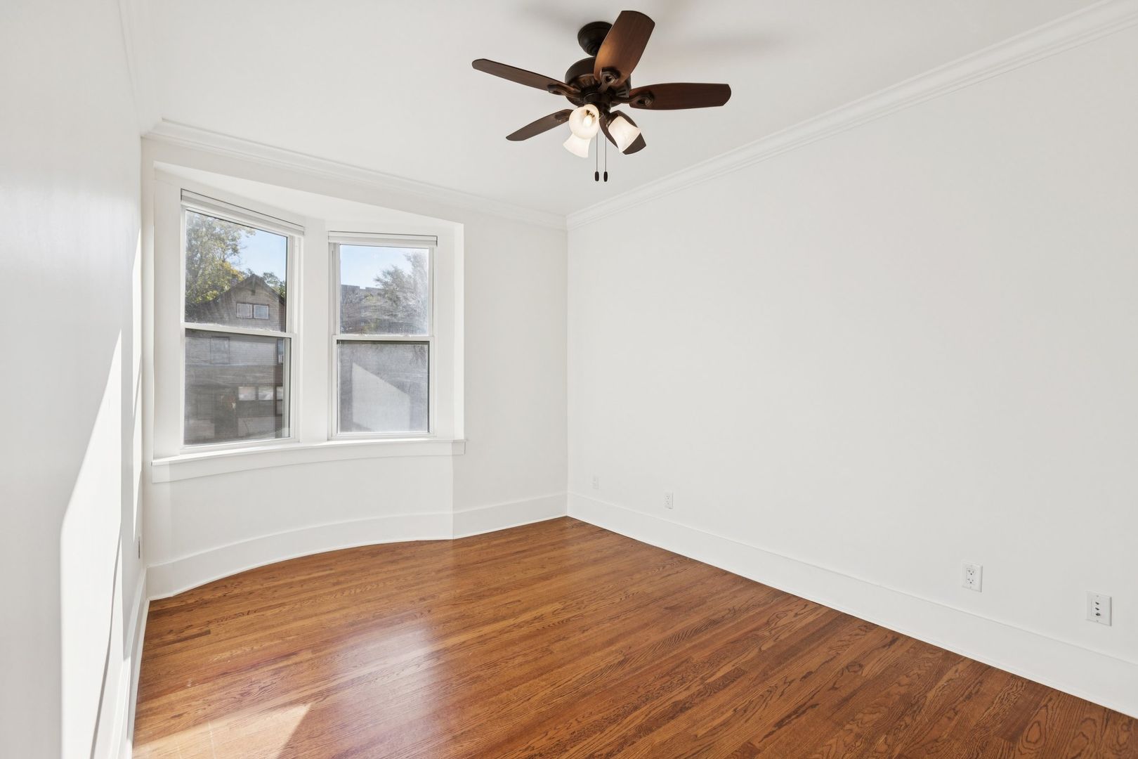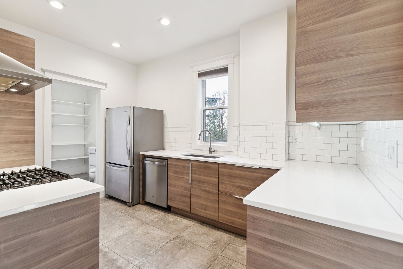 The modern chef’s kitchen is equipped with quartz countertops, high-end stainless steel appliances, and a spacious pantry, perfect for cooking and entertaining. Original hardwood floors run throughout the home, adding warmth and character to every room.