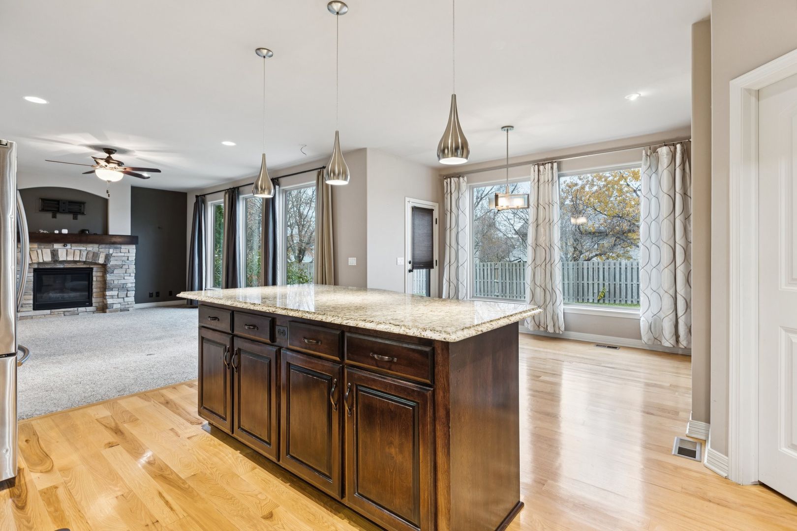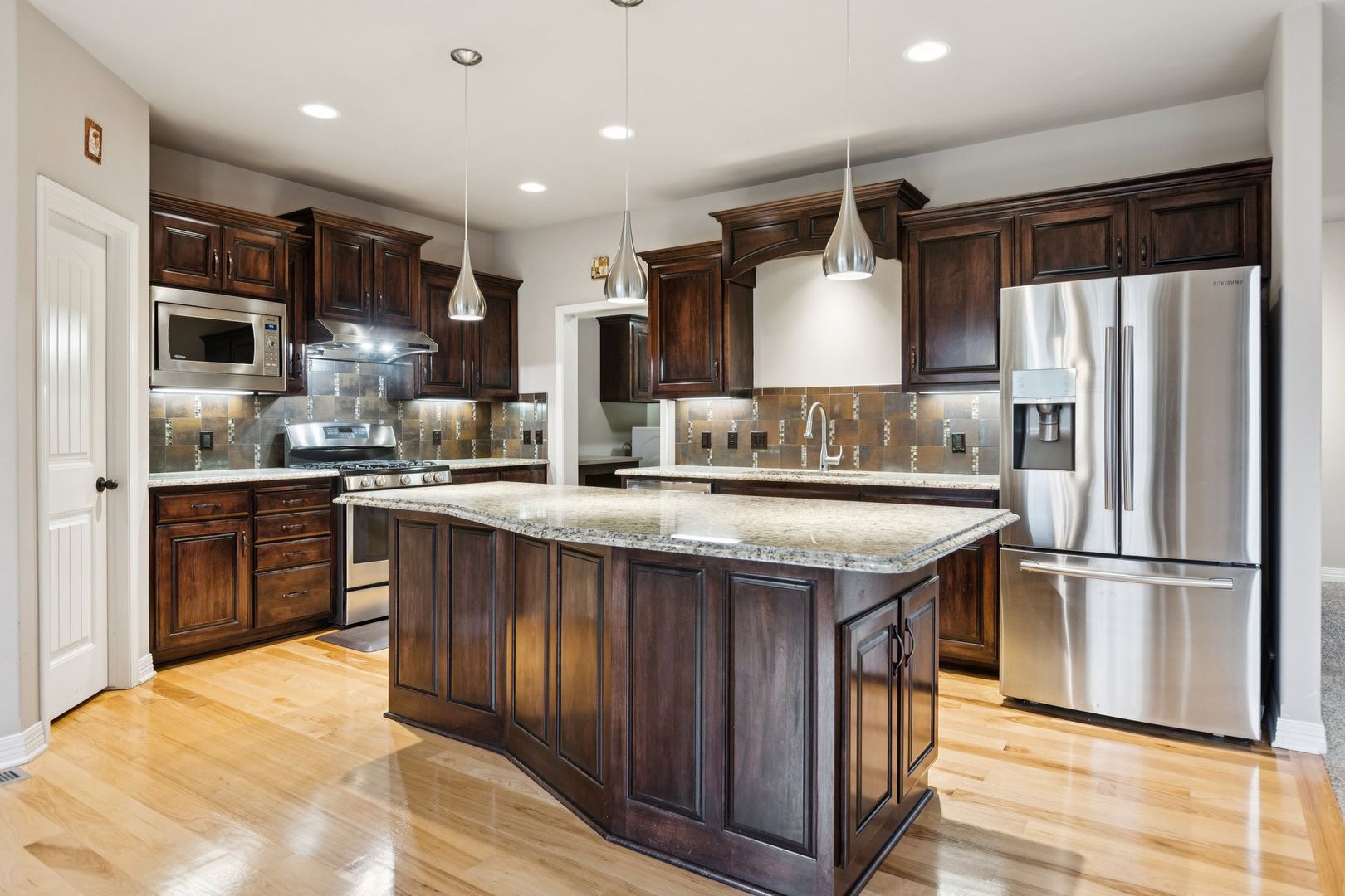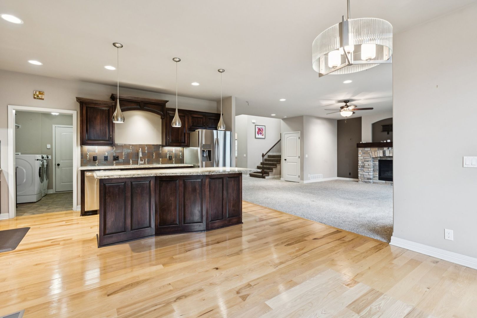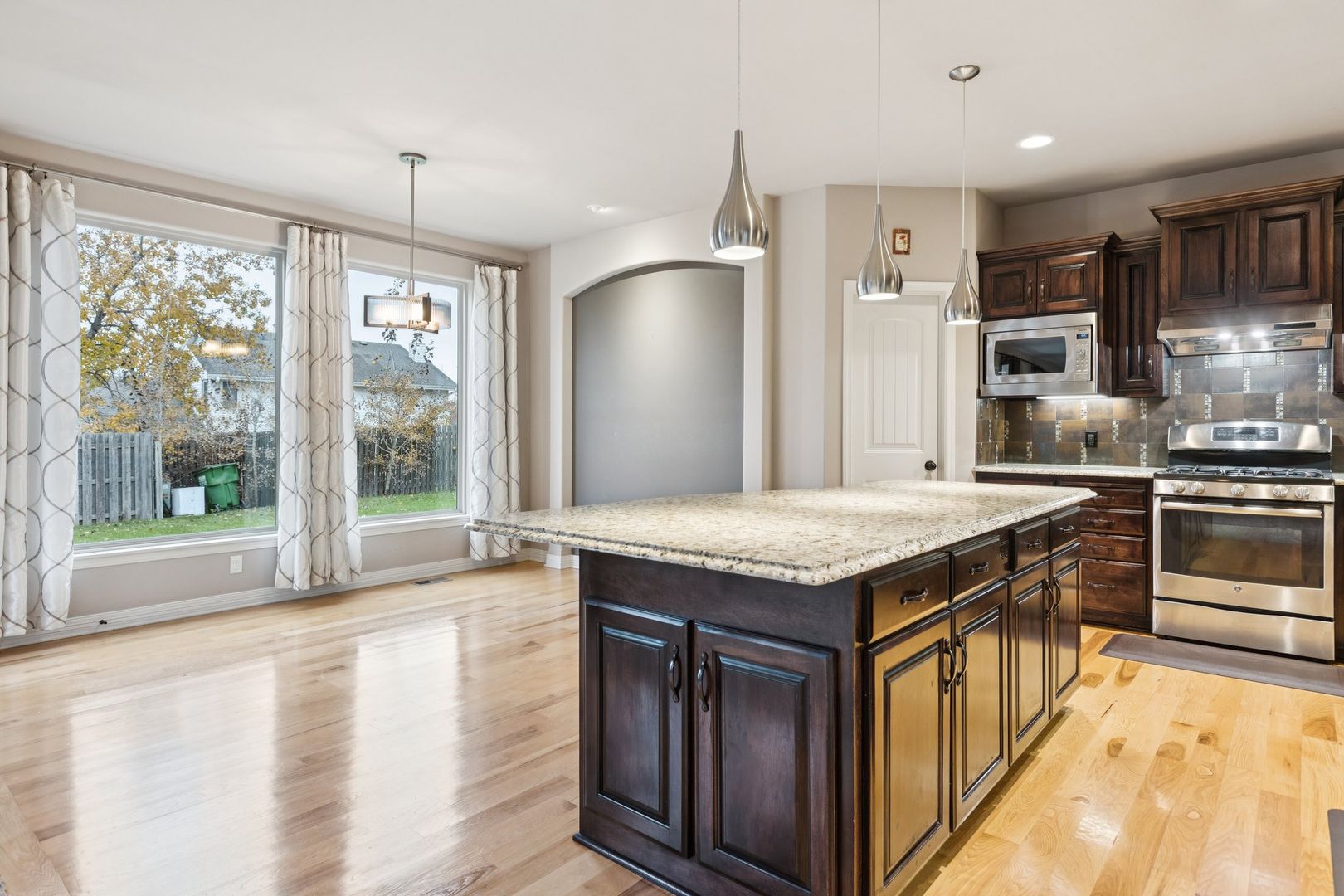 The open-concept main level provides an inviting flow, featuring a bright living area and an eat-in kitchen with a large center island, perfect for meal prep, extra seating, and entertaining. With abundant storage and convenient access to the backyard, this kitchen truly serves as the heart of the home.