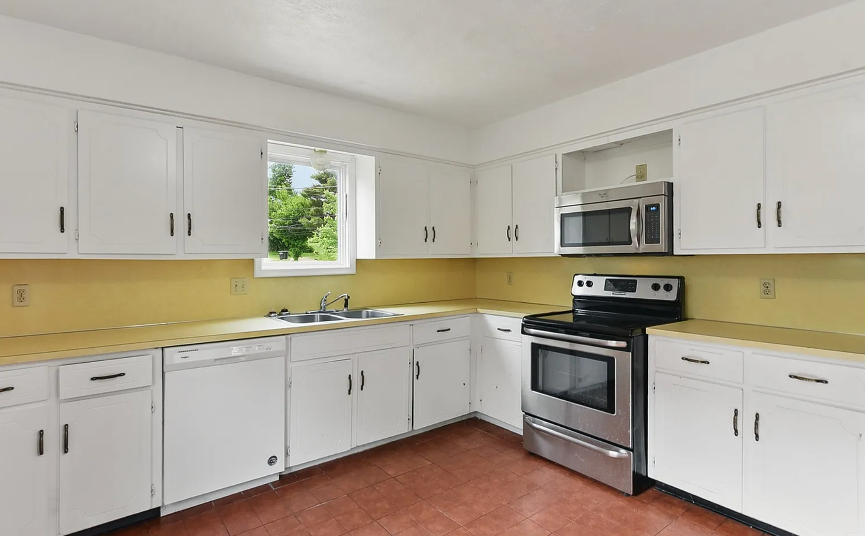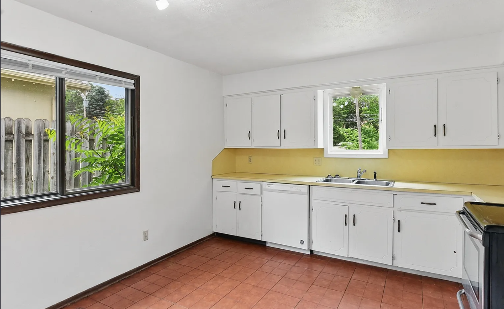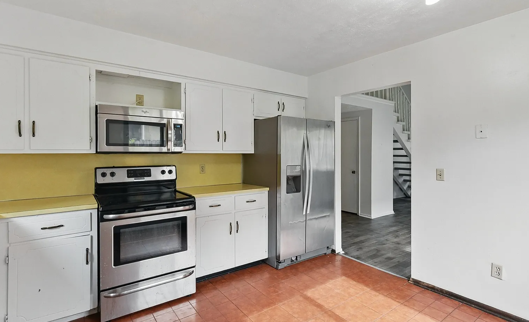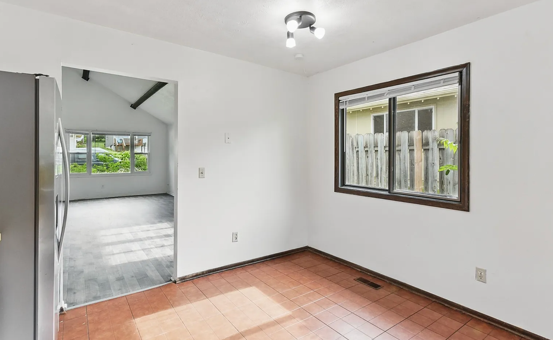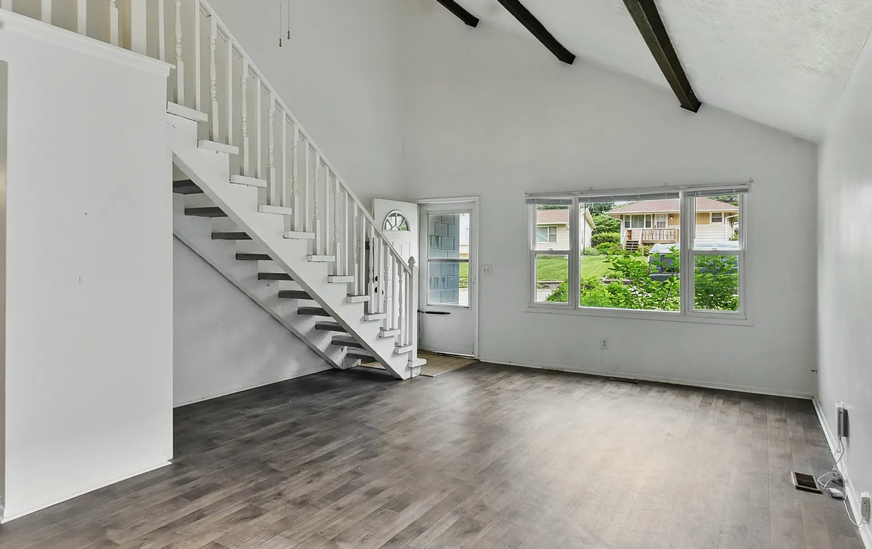 The living room welcomes you with high ceilings and exposed beams, while the bright eat-in kitchen offers plenty of storage and natural light. All three bedrooms are generously sized and include large closets, giving you the space you need.