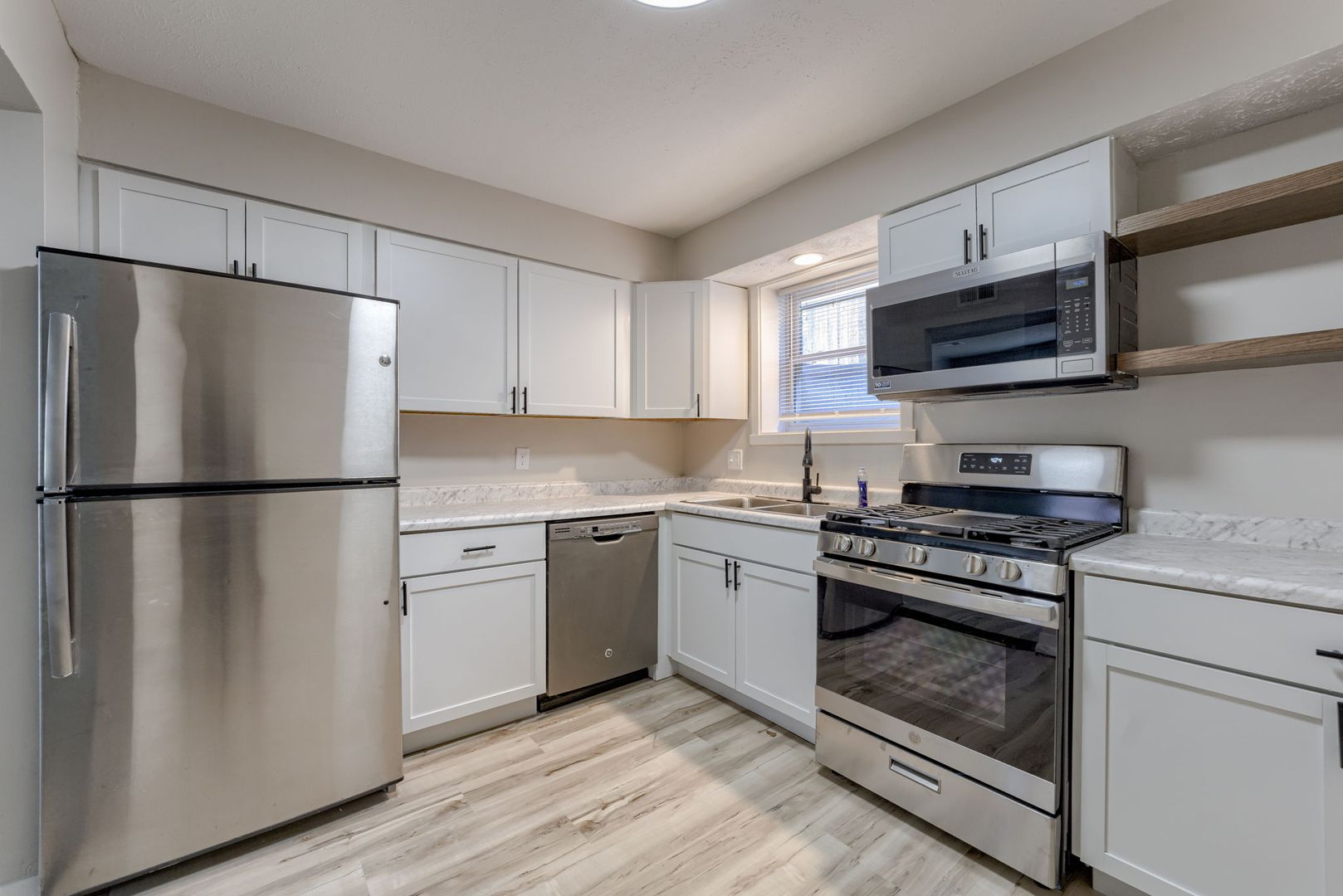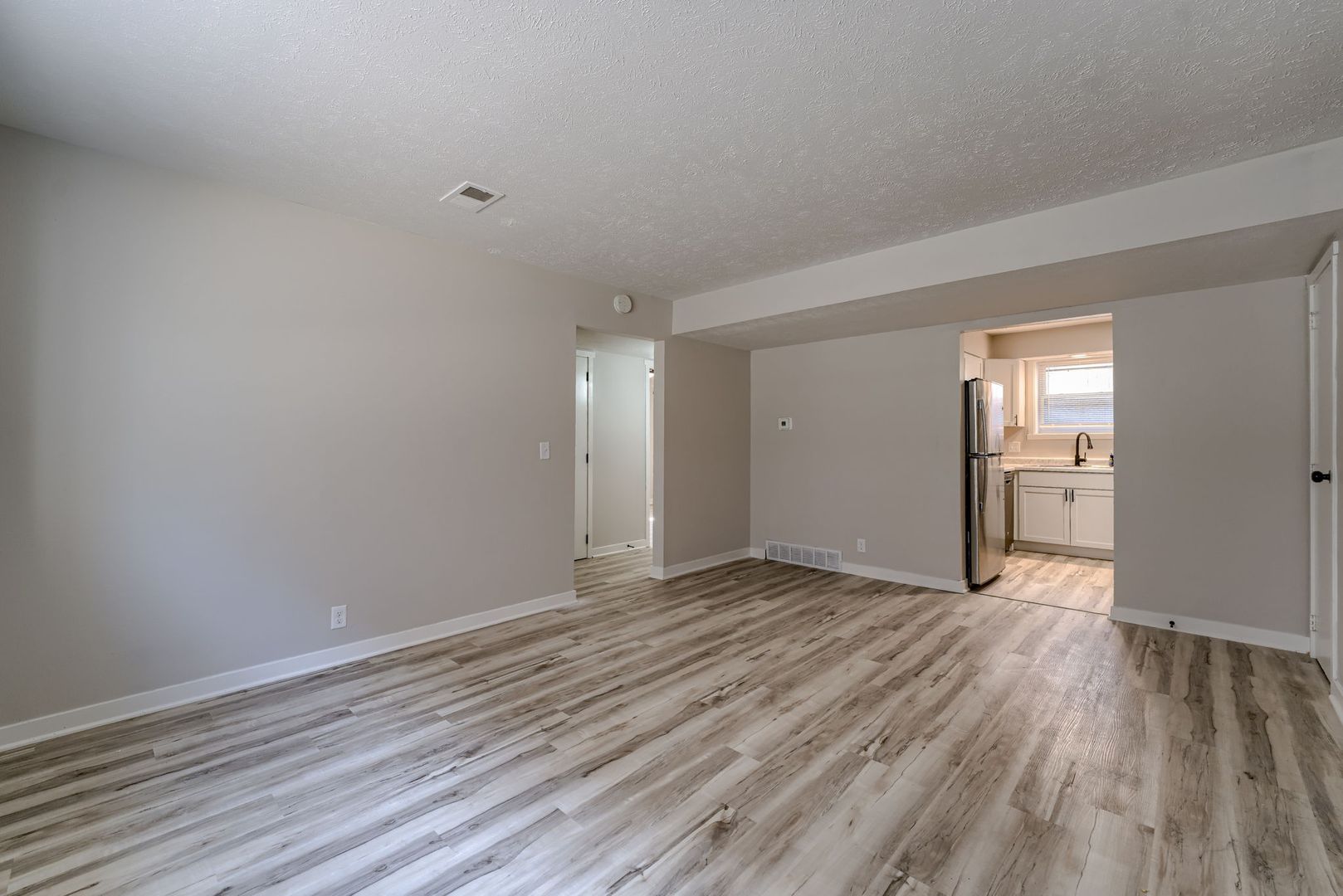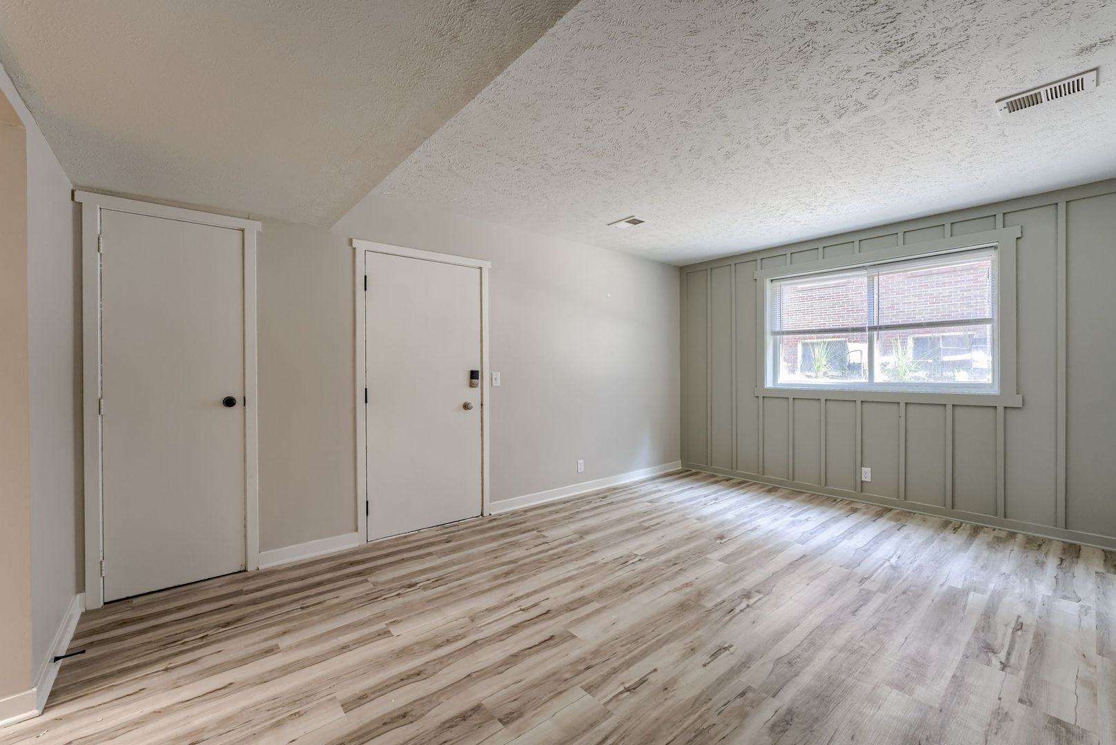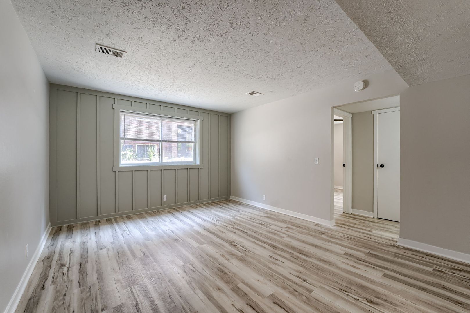 The space features updated flooring and thoughtful touches like an accent wall in the living room. The kitchen includes modern cabinets and appliances, and both bedrooms are a generous size.