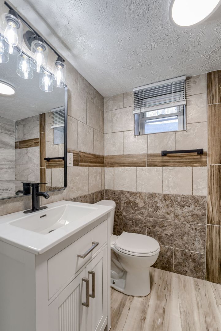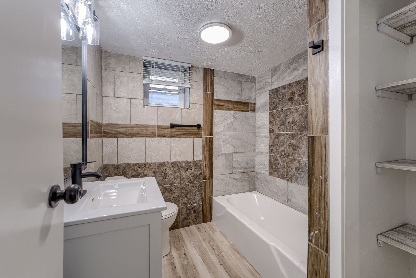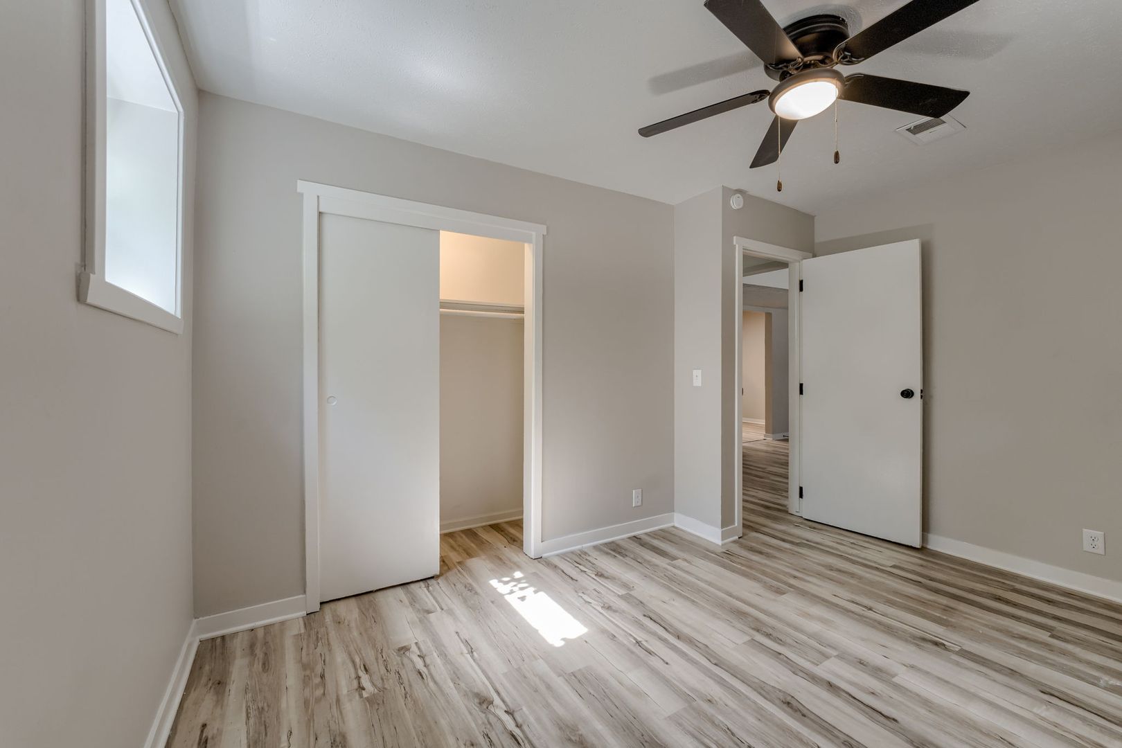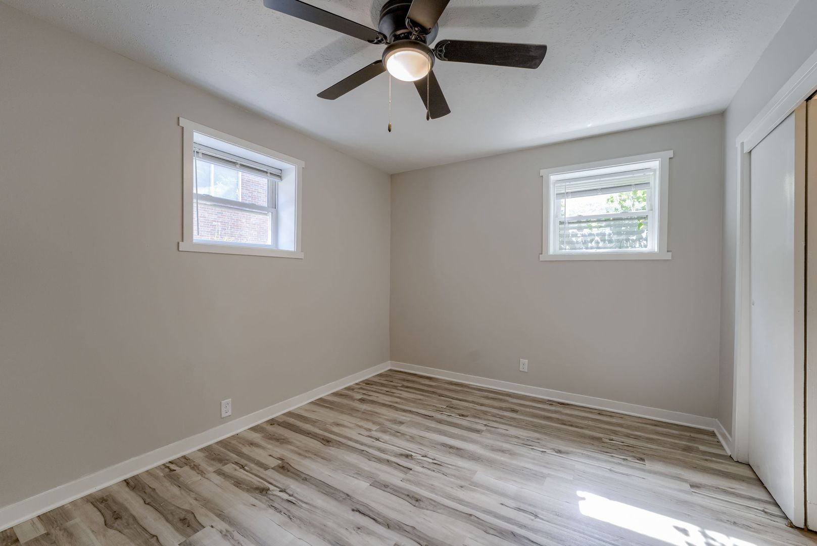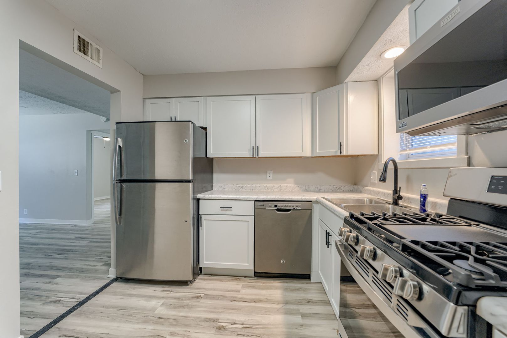 The space features updated flooring and thoughtful touches like an accent wall in the living room. The kitchen includes modern cabinets and appliances, and both bedrooms are a generous size.